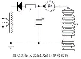 微安表必須有金屬屏蔽,應采用屏蔽與被試品聯(lián)接。高壓引線的屏蔽引出應與儀表端的屏蔽緊密聯(lián)接。如果被試品的表現(xiàn)污穢要排除被試品表面泄漏電流的影響可在被試品高電位端用裸體金屬軟線緊密繞幾圈后與高壓引線的屏蔽相聯(lián)接(見下圖)。