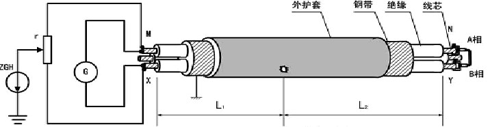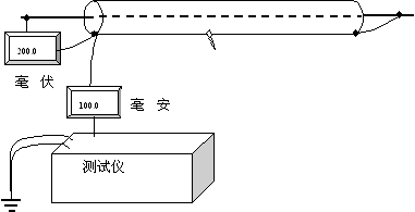 接線圖如下,在測試端的芯線和外護套上接毫伏表(萬用表毫伏檔),表筆直接與芯線和外護套接緊,不要接到儀器輸出線的夾子上,避免接觸電阻影響毫伏表的測量結果;儀器設置在連續(xù)輸出檔,調整輸出電壓,使輸出電流達到A1(整數(shù)如100.0mA),這時讀取毫伏表上的讀數(shù)V,由于電壓表輸入電阻很高,因此,流經(jīng)項線的電流很小,可以認為毫伏表的電位測量端到故障點的電位,因此,該讀數(shù)即為測量端到故障點兩點的電位差V1。再將儀器移到電纜的另一側(末端)進行測量,讓輸出電流值與始端測量時的數(shù)值一致,這時毫伏表的讀數(shù)為V2;