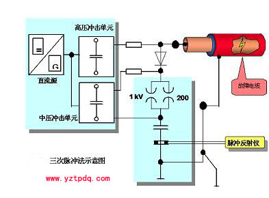 三次脈沖法是二次脈沖法的升級。其方法是首先在不擊穿被測電纜故障點的情況下,測得低壓脈沖的反射波形,緊接著用高壓脈沖擊穿電纜的故障點產(chǎn)生電弧,在電弧電壓降到一定值時觸發(fā)中壓脈沖來穩(wěn)定和延長電弧時間。之后再發(fā)出低壓脈沖,從而得到故障點的反射波形,兩條波形疊加后同樣可以發(fā)現(xiàn)發(fā)散點就是故障點對應的位置。由于采用了中壓脈沖來穩(wěn)定和延長電弧時間,它比二次脈沖法更容易得到故障點波形。相對于二次脈沖法由于三次脈沖法不用選擇燃弧的同步時長,操作起來也更加簡便。三次脈沖代表性儀器為:三級多次電纜故障測試儀。