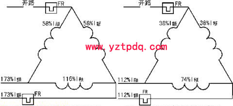 三角形接法的電動機(jī)在滿載運(yùn)行時,如果一相斷電,則其余兩根電源線中的線電流約為額定電流的173%,熱繼電器能動作,可以起到斷相保護(hù)作用。如果電動機(jī)在55%—67%額定負(fù)載下運(yùn)行,電源一相斷電(見圖左),這時兩相繞組的電流為38% 額定線電流。一相繞組的電流為74%額定線電流,大于原額定相電流(58%I額),這相繞組的過電流為: