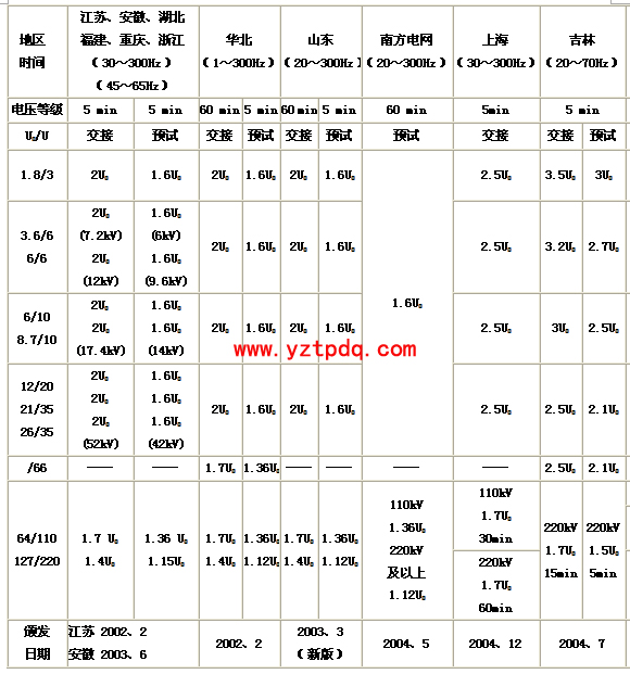國(guó)內(nèi)部分地區(qū)(?。┰囼?yàn)電壓標(biāo)準(zhǔn)