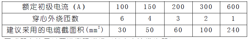 3、初級(jí)電流為100A~600A時(shí),初級(jí)繞組穿心匝數(shù)和導(dǎo)線截面積按下表選擇:
