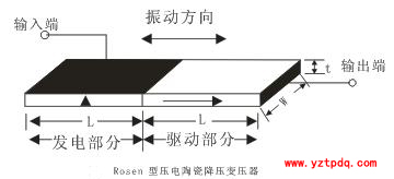 整個壓電變壓器可以分成兩部分:下半部分沿厚度方向極化且沿徑向應(yīng)變,作為輸入端,稱為驅(qū)動部分;上半部分也沿厚度方向極化且沿徑向應(yīng)變,作為輸出端,稱為感應(yīng)部分。當正弦交變電壓加到輸入端時,壓電變壓器產(chǎn)生沿徑向振動;而感應(yīng)部分通過正壓電效應(yīng),產(chǎn)生電壓輸出。