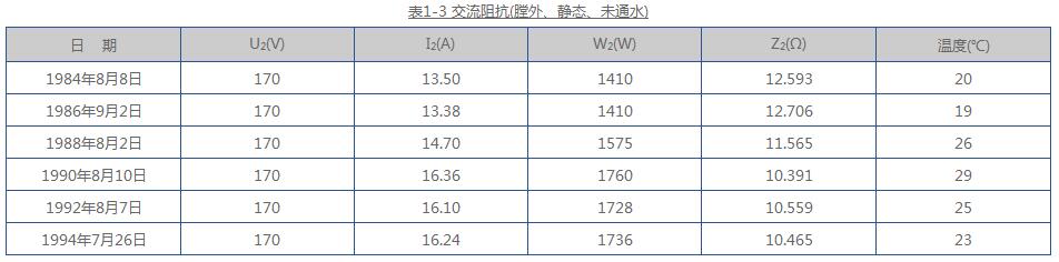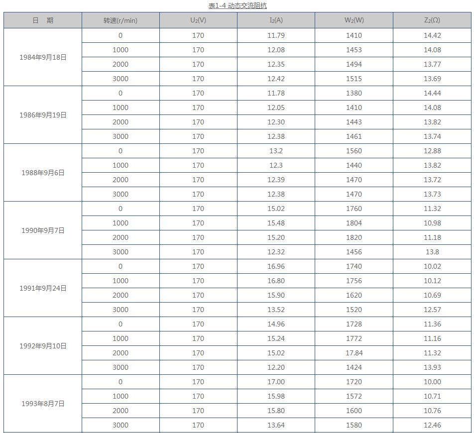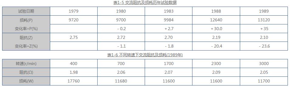 從表1-5及表1-6中可見(jiàn),1979~1989年間,交流阻抗是逐年減少,而損耗卻逐年增加;在不同轉(zhuǎn)速下的交流阻抗隨轉(zhuǎn)速的變化不大,說(shuō)明轉(zhuǎn)子繞組短路為穩(wěn)定性短路。