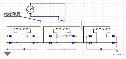 這種方式的電路示意圖如圖3所示。特點(diǎn)是,磁芯是由多段組合而成,每段磁芯之間都用絕緣性能很好的薄膜進(jìn)行絕緣。每段磁芯都有一個次級繞組。優(yōu)點(diǎn)是:適合較大功率的輸出。變壓器數(shù)量少,只需要一副磁芯。每段次級繞組與磁芯的電壓差小,次級繞組對磁芯的絕緣容易處理。缺點(diǎn)是:磁芯是分段的,結(jié)構(gòu)復(fù)雜。磁芯有氣隙,分段越多,等效氣隙越大,磁芯固定困難。