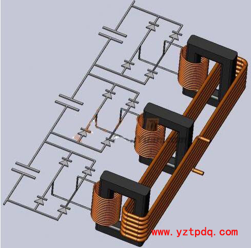 多變壓器共初級次級級聯(lián)方式的電路示意圖如下圖所示。為了能看的直觀一些,這里畫了一張3D的圖紙,為了畫出這個示意圖,畫了好長時間,特別是初級的那個線圈,看上去簡單,很費(fèi)了一番力氣!這種結(jié)構(gòu)的特點(diǎn)是多個變壓器組合,初級為串聯(lián)結(jié)構(gòu),次級獨(dú)立整流以后再串聯(lián)。優(yōu)點(diǎn)是:適合大功率的輸出,變壓器的升壓比不大。缺點(diǎn)是:初、次級對磁芯之間總有一個絕緣要求高,需要多個變壓器。