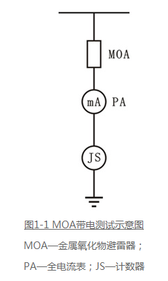 金屬氧化物避雷器目前廣泛采用一體化結(jié)構(gòu)即制造廠家在計數(shù)器前邊串一只全電流mA表,在運(yùn)行電壓下測量全電流值,根據(jù)此電流值大小,判斷MOA的運(yùn)行狀態(tài)。接線圖如圖1-1所示。