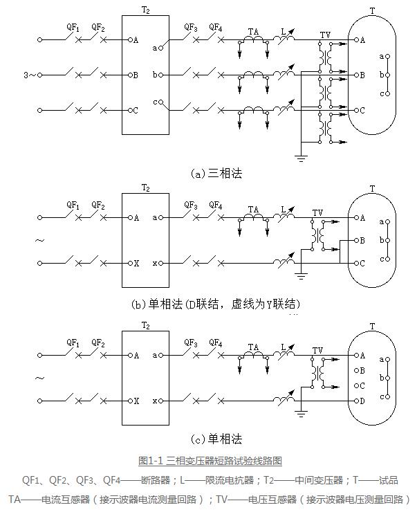 3、對于三角形聯(lián)結(jié)的繞組進(jìn)行三相試驗(yàn)時(shí),如果低壓側(cè)為星形聯(lián)結(jié),可采用測量低壓電流的方法;對于三角形聯(lián)結(jié)的繞組進(jìn)行單相試驗(yàn)時(shí),單相電壓應(yīng)施加在三角形的兩個(gè)角上,試驗(yàn)時(shí)的電壓應(yīng)與三相試驗(yàn)時(shí)的相間電壓相同;對于星形聯(lián)結(jié)繞組,如果電源容量不足以進(jìn)行上述單相試驗(yàn),而中性點(diǎn)可以利用且能承受相關(guān)的電流時(shí),經(jīng)協(xié)商單相電源可施加于線端與中性點(diǎn)之間;具體的短路試驗(yàn)的線路原理見圖1-1。